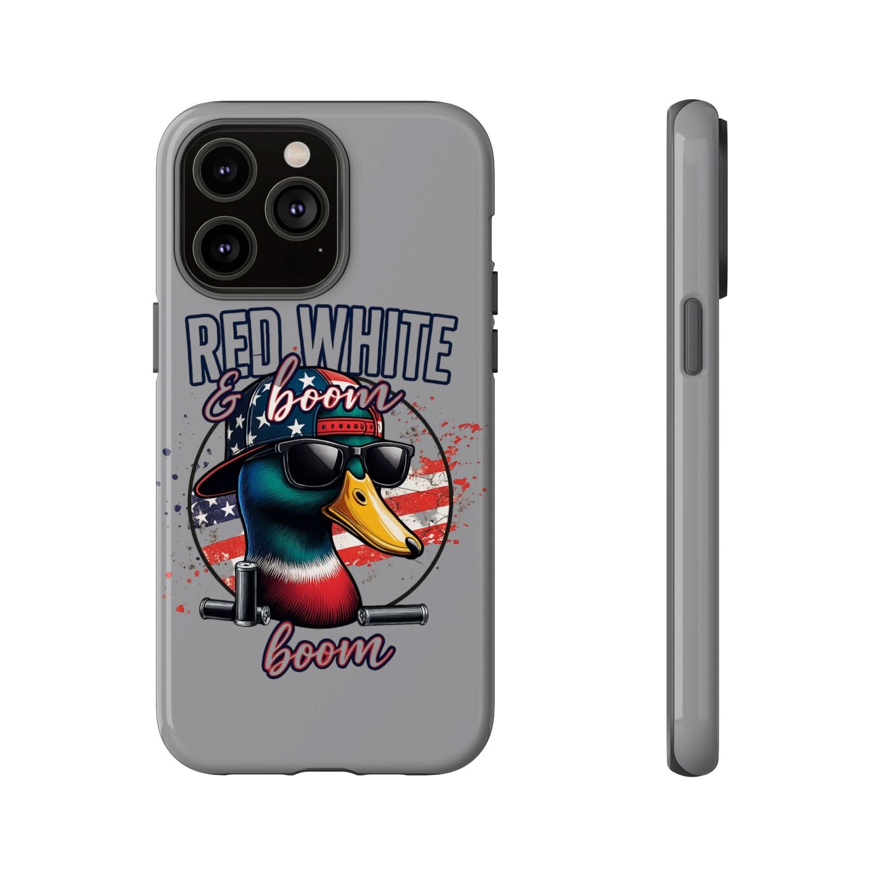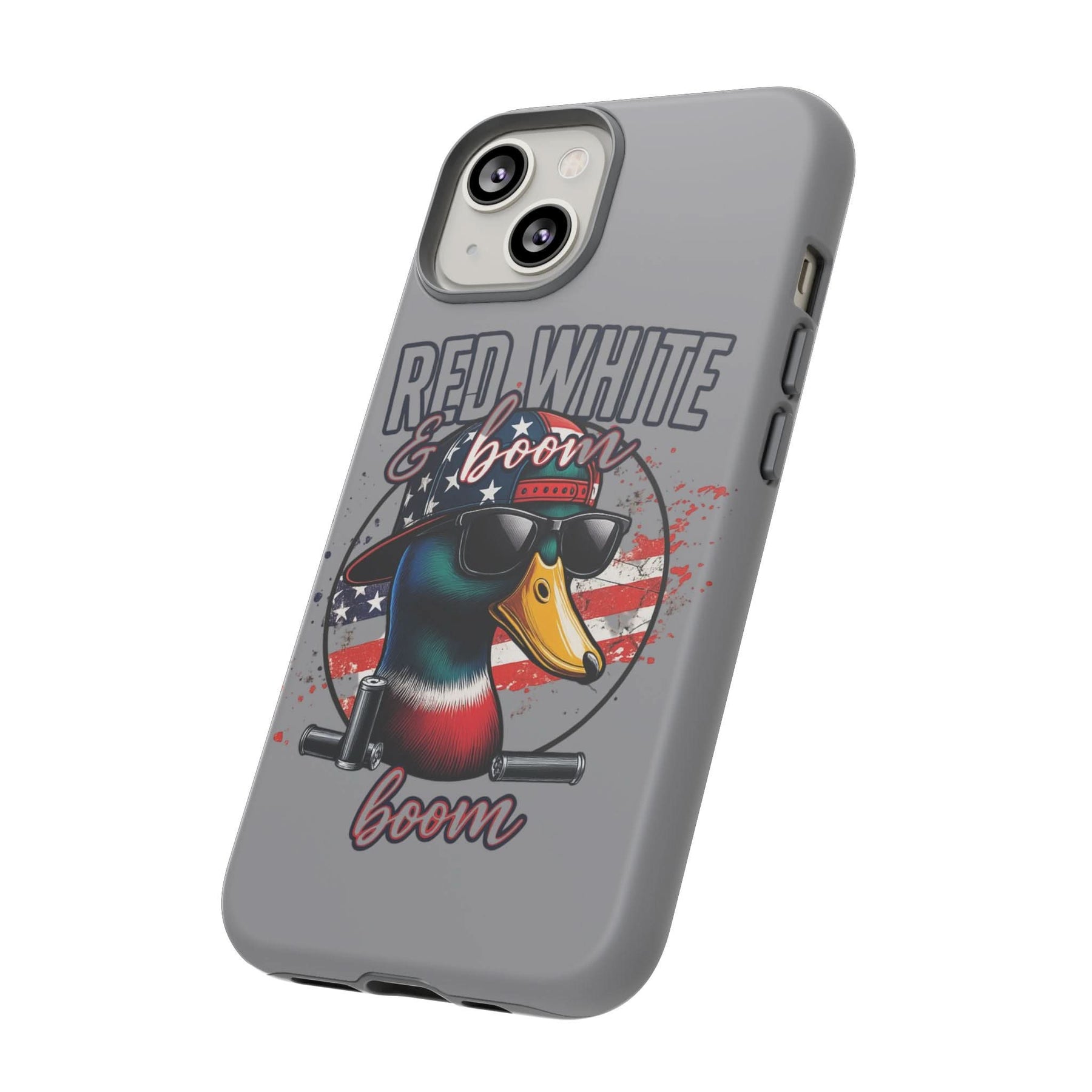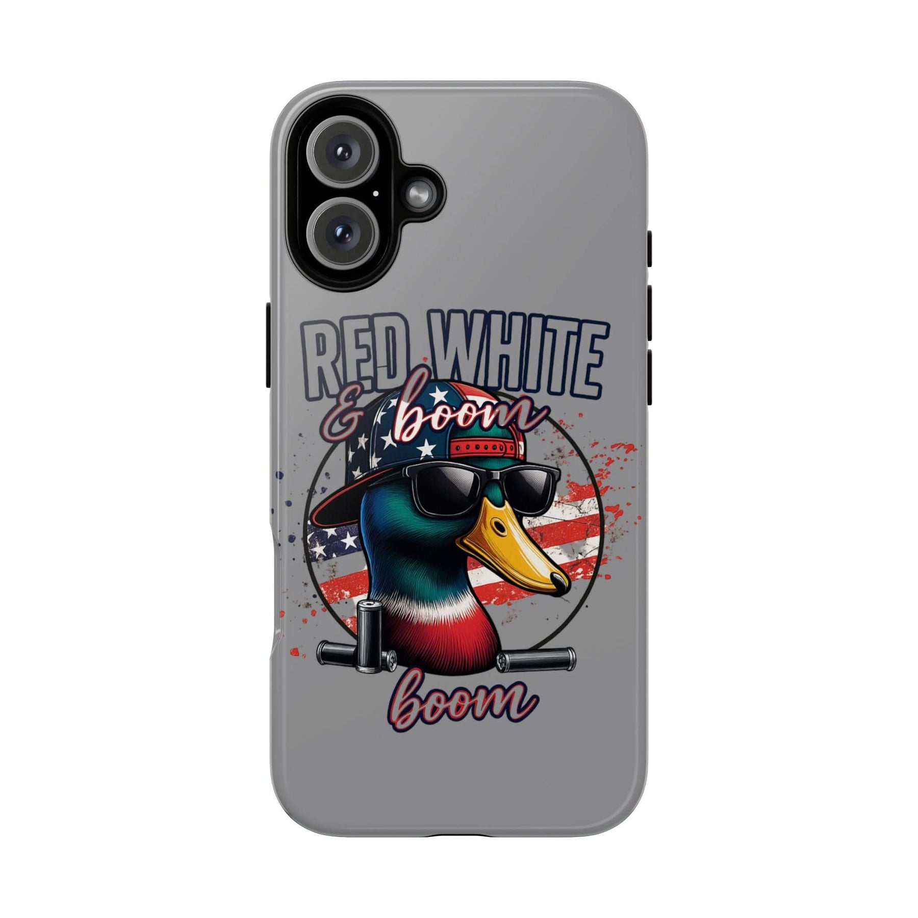 Celebrate freedom with a bang! This "Red, White & Boom" iPhone case features a patriotic duck rocking sunglasses and a backward USA hat, backed by an American flag and twin fireworks cannons. Made for those who love bold designs and big booms, it's the perfect accessory for Independence Day and beyond. Lightweight, durable, and guaranteed to turn heads – just like fireworks in the sky.