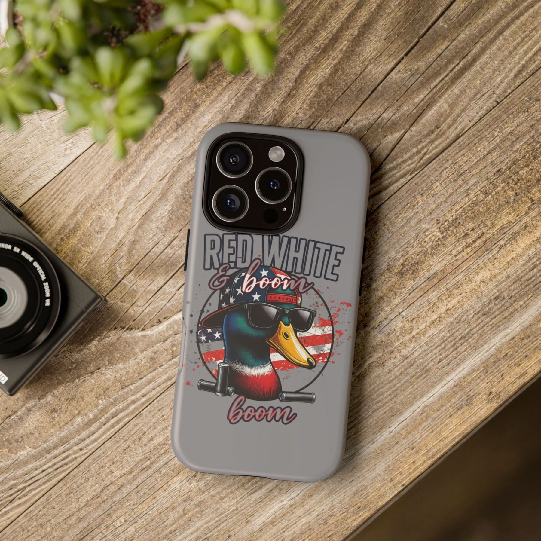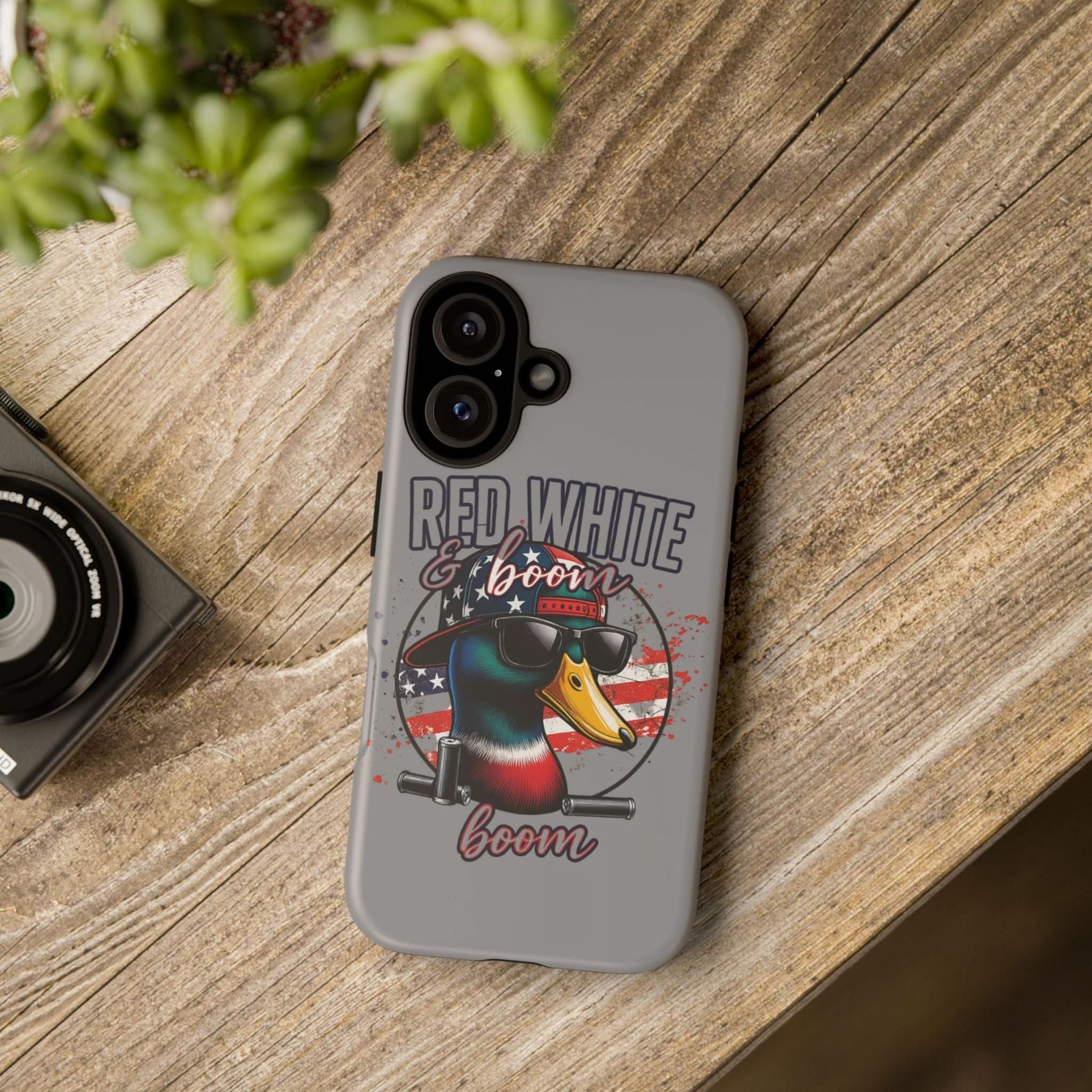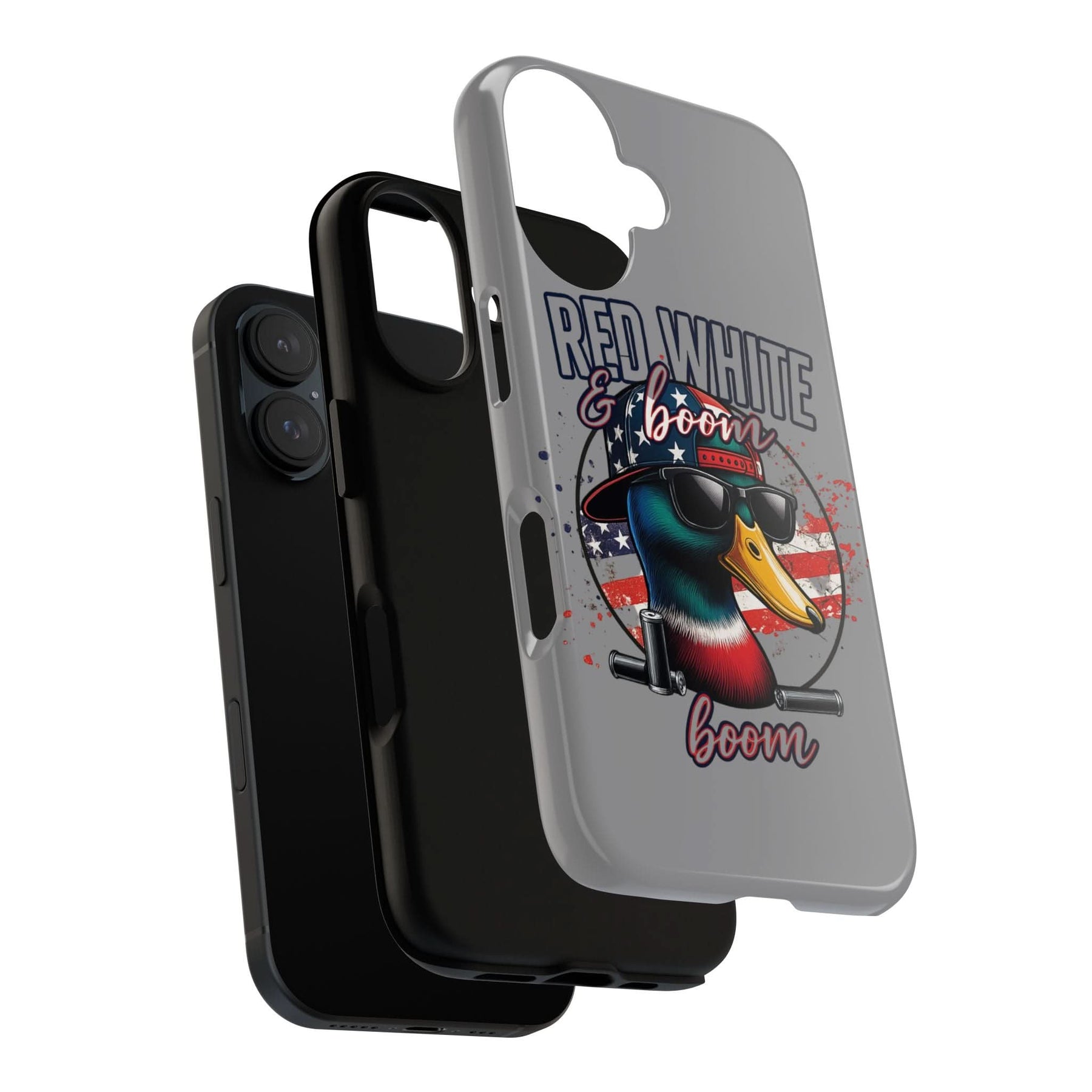 Celebrate freedom with a bang! This "Red, White & Boom" iPhone case features a patriotic duck rocking sunglasses and a backward USA hat, backed by an American flag and twin fireworks cannons. Made for those who love bold designs and big booms, it's the perfect accessory for Independence Day and beyond. Lightweight, durable, and guaranteed to turn heads – just like fireworks in the sky.