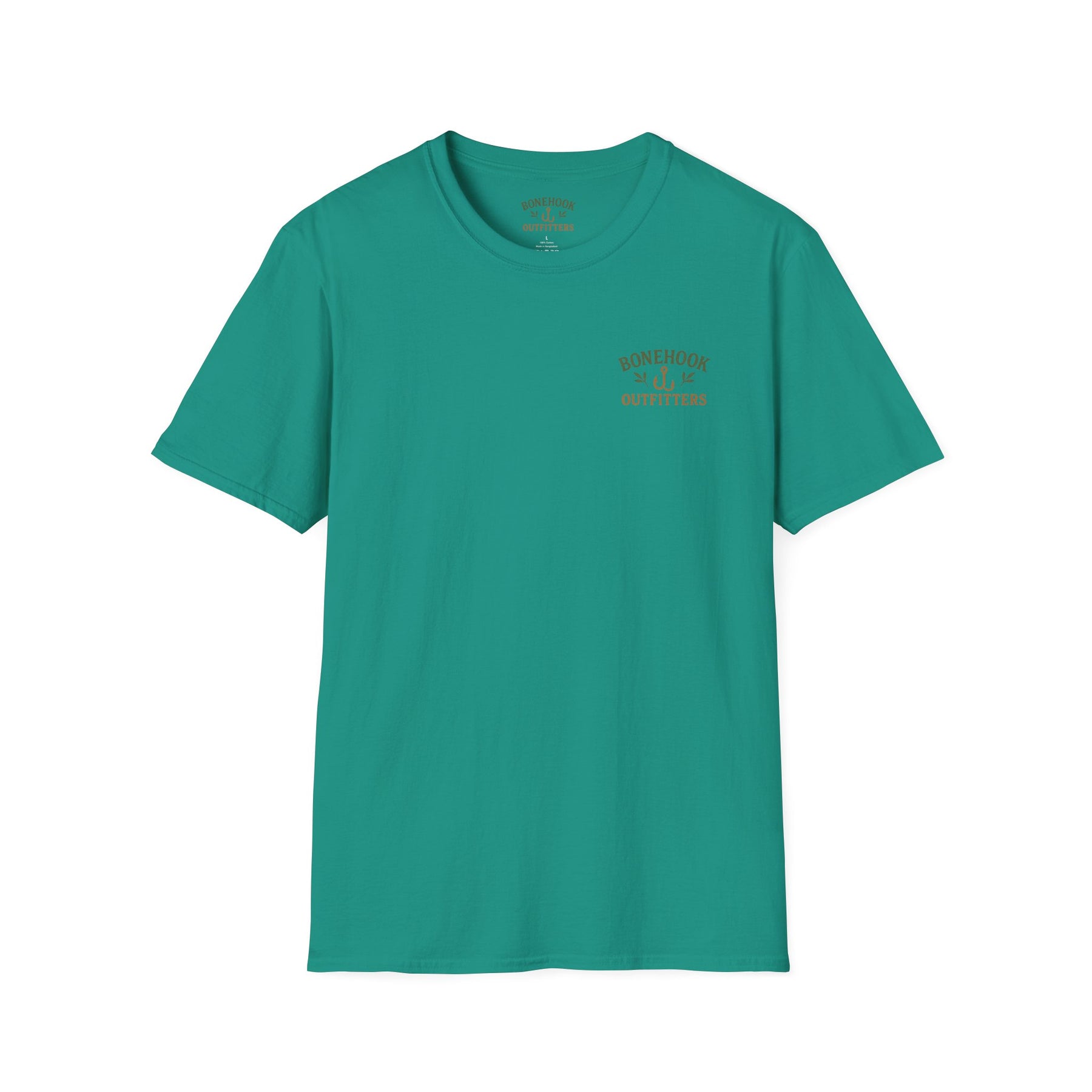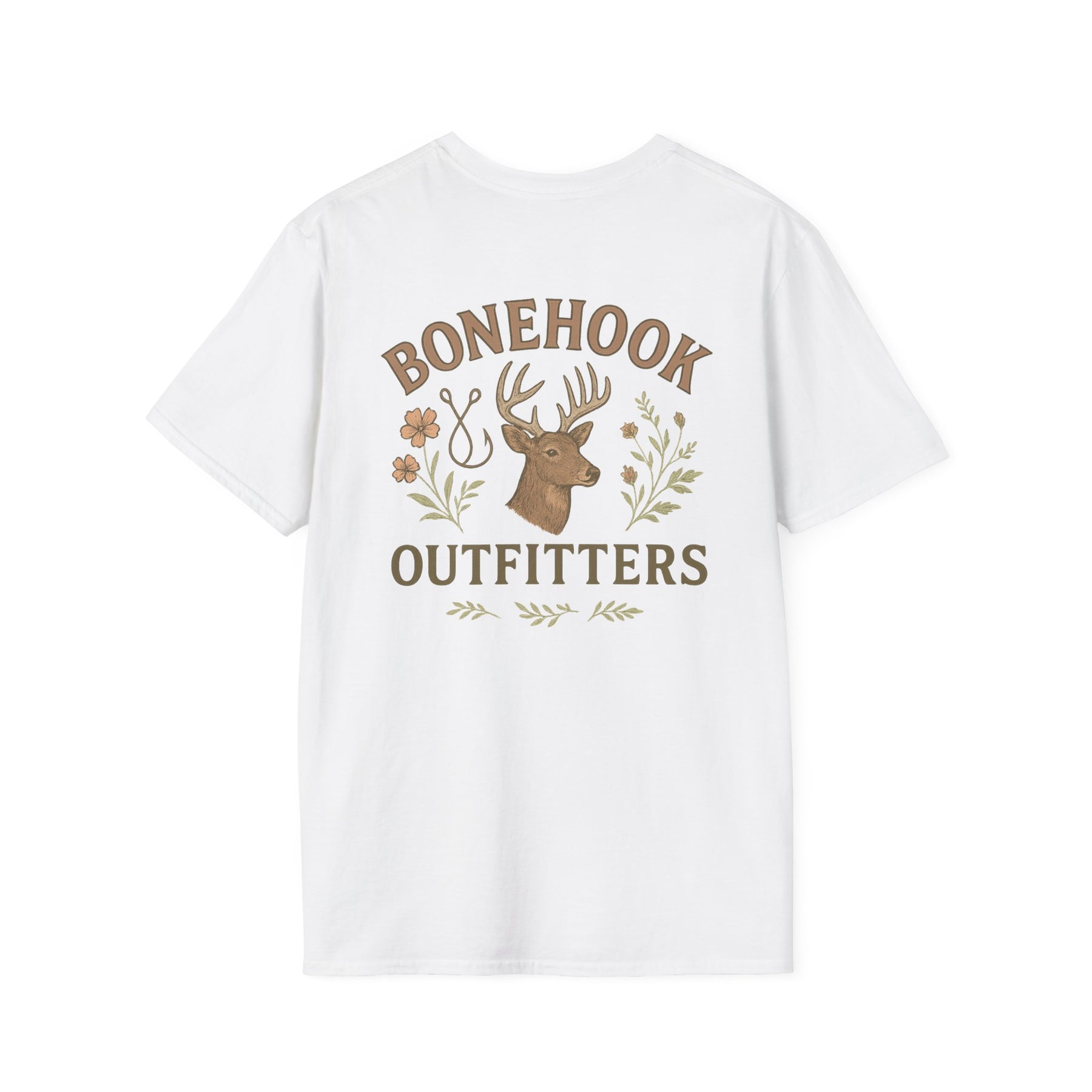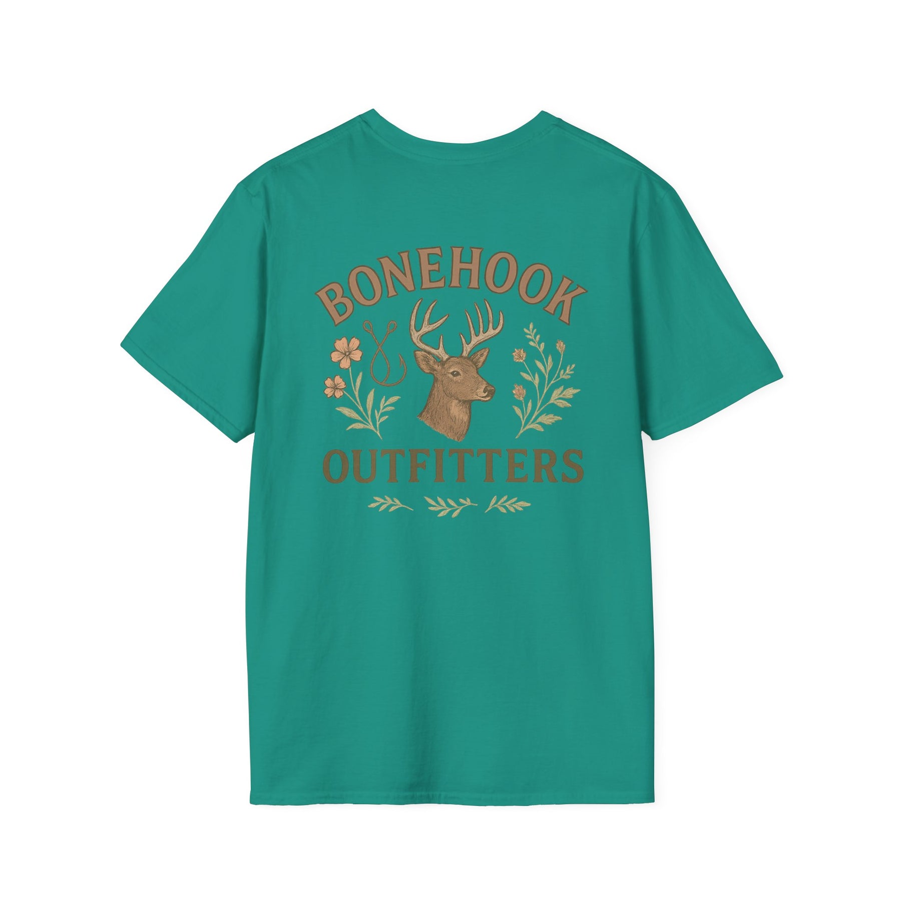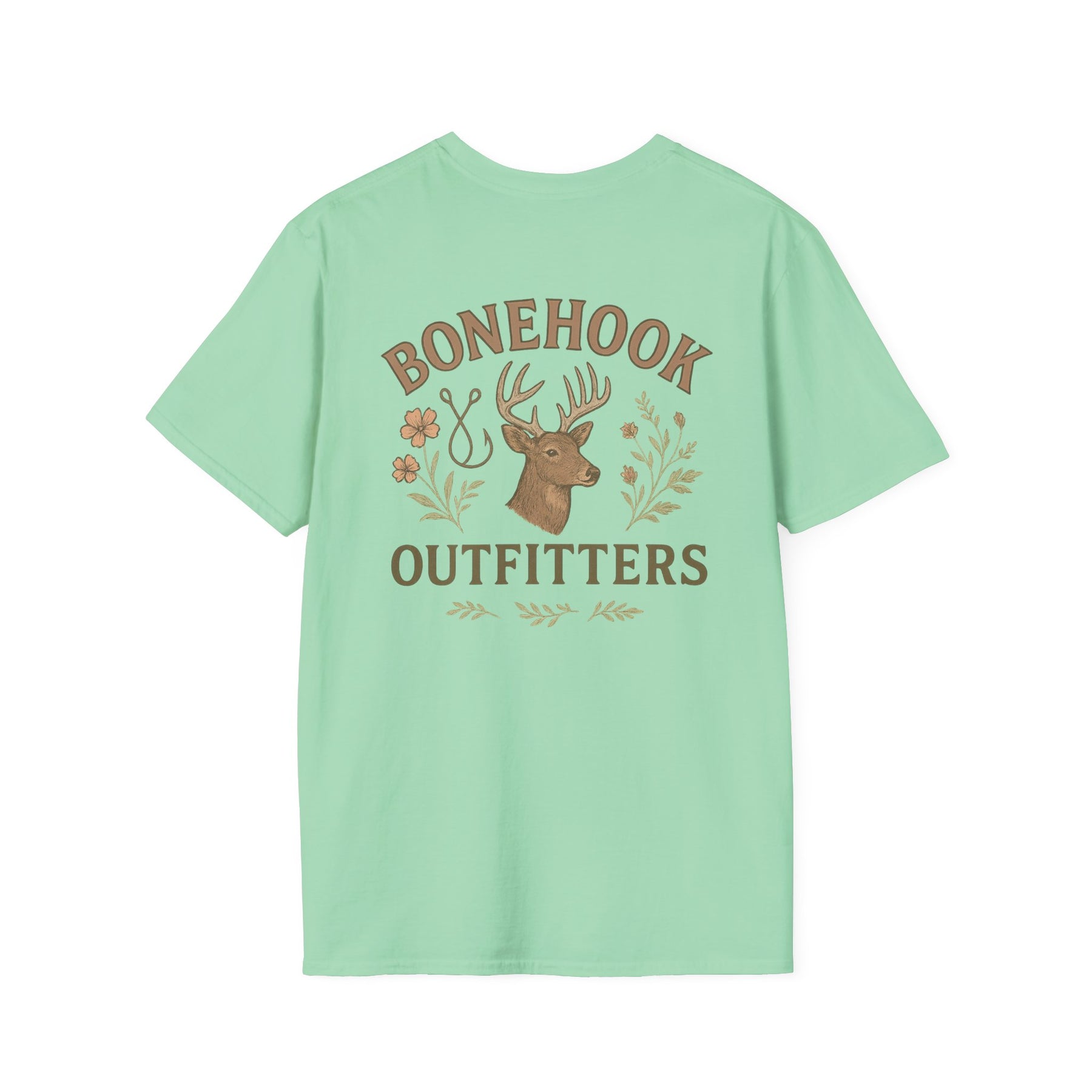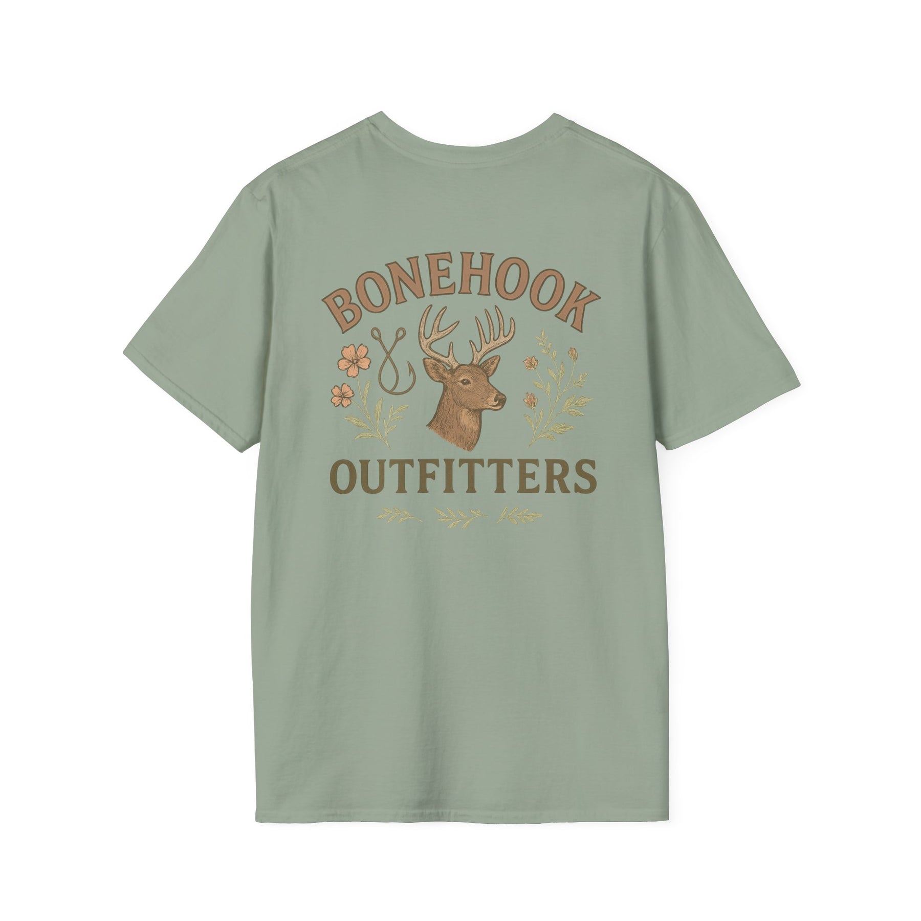 Bold meets beautiful in the Bonehook Outfitters Deer & Hook tee — designed for women who live and breathe the outdoors. This sage green shirt features a vintage-inspired buck graphic surrounded by subtle floral accents, rustic fishing hooks, and classic southern script. Whether you're casting a line, walking a field, or relaxing by the fire, this shirt brings rugged tradition and feminine charm together in one unforgettable look.